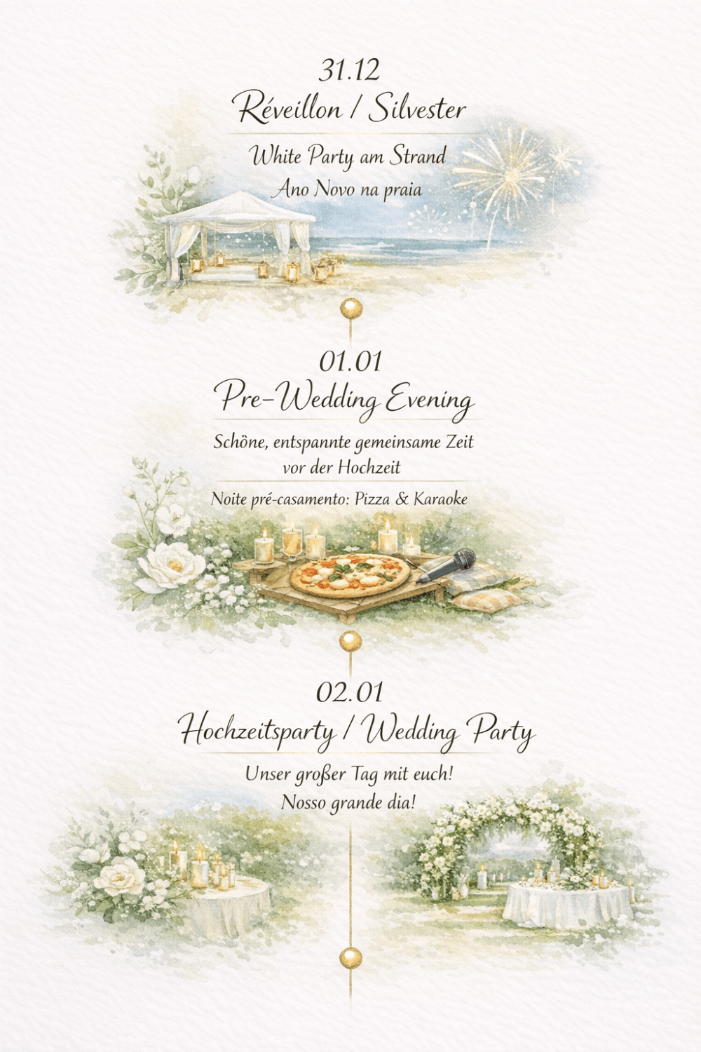 Die Zeremonie und der Empfang, gefolgt von der Feier, finden in der Pousada Windvillage — Ilha do Guajiru, Ceará — um 15:00 Uhr statt.